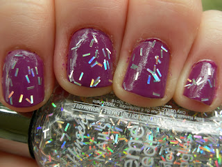 I've been ogling "In the Spotlight" for ages, wondering how dense the glitter actually is. Looks like it's just the right amount to avoid the hairy-nail look. :) I love it over the purple!